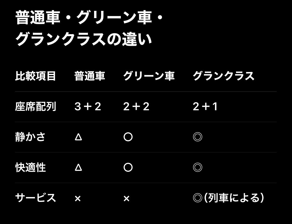 ChatGPTに、グランクラスと普通車(グリーン車含む)の違いを表にまとめてもらいました👇