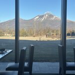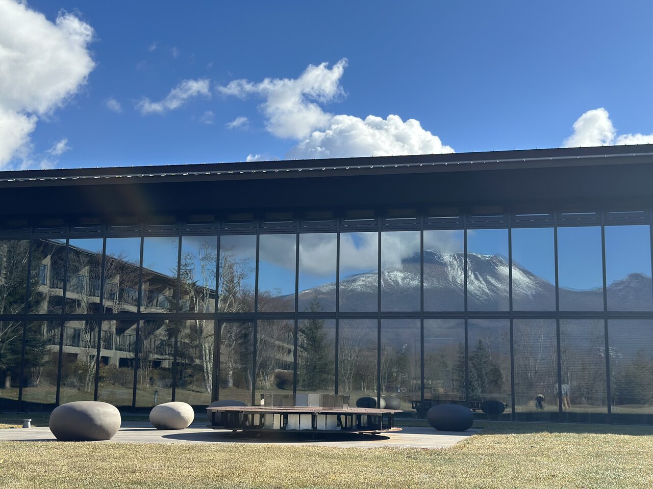 振り返ると、ホテルの窓に映るもうひとつの浅間山。