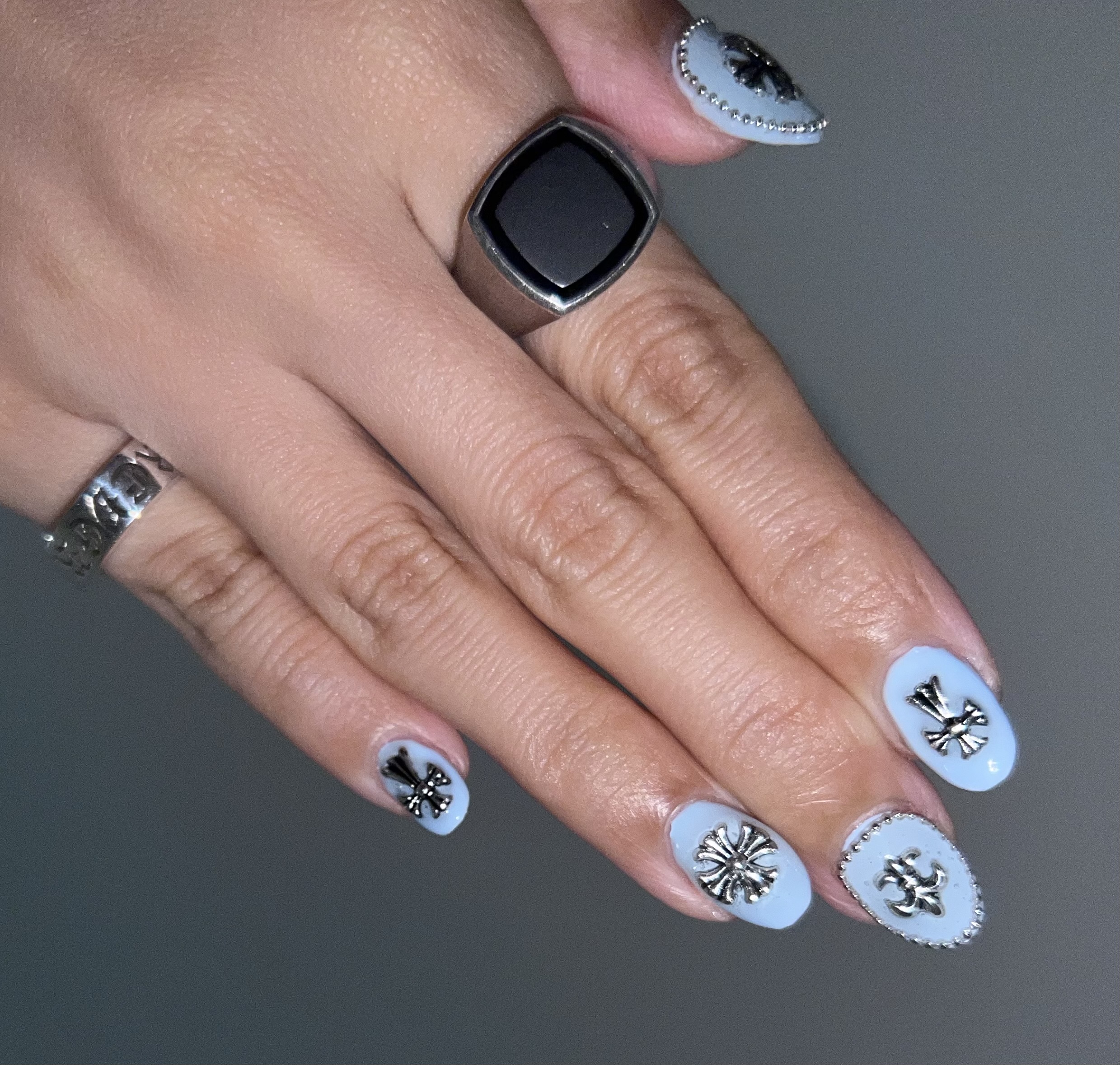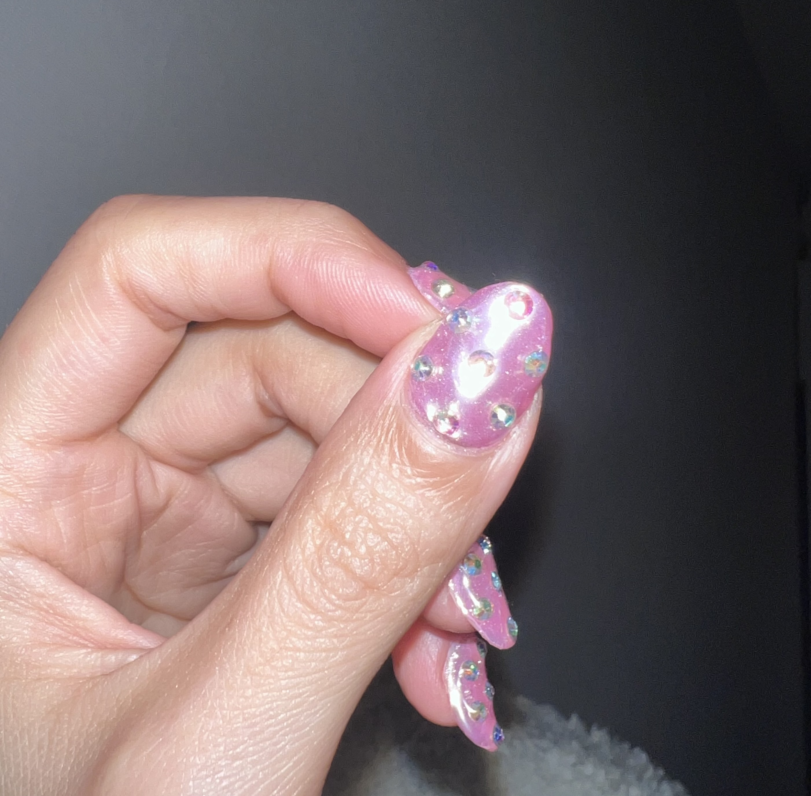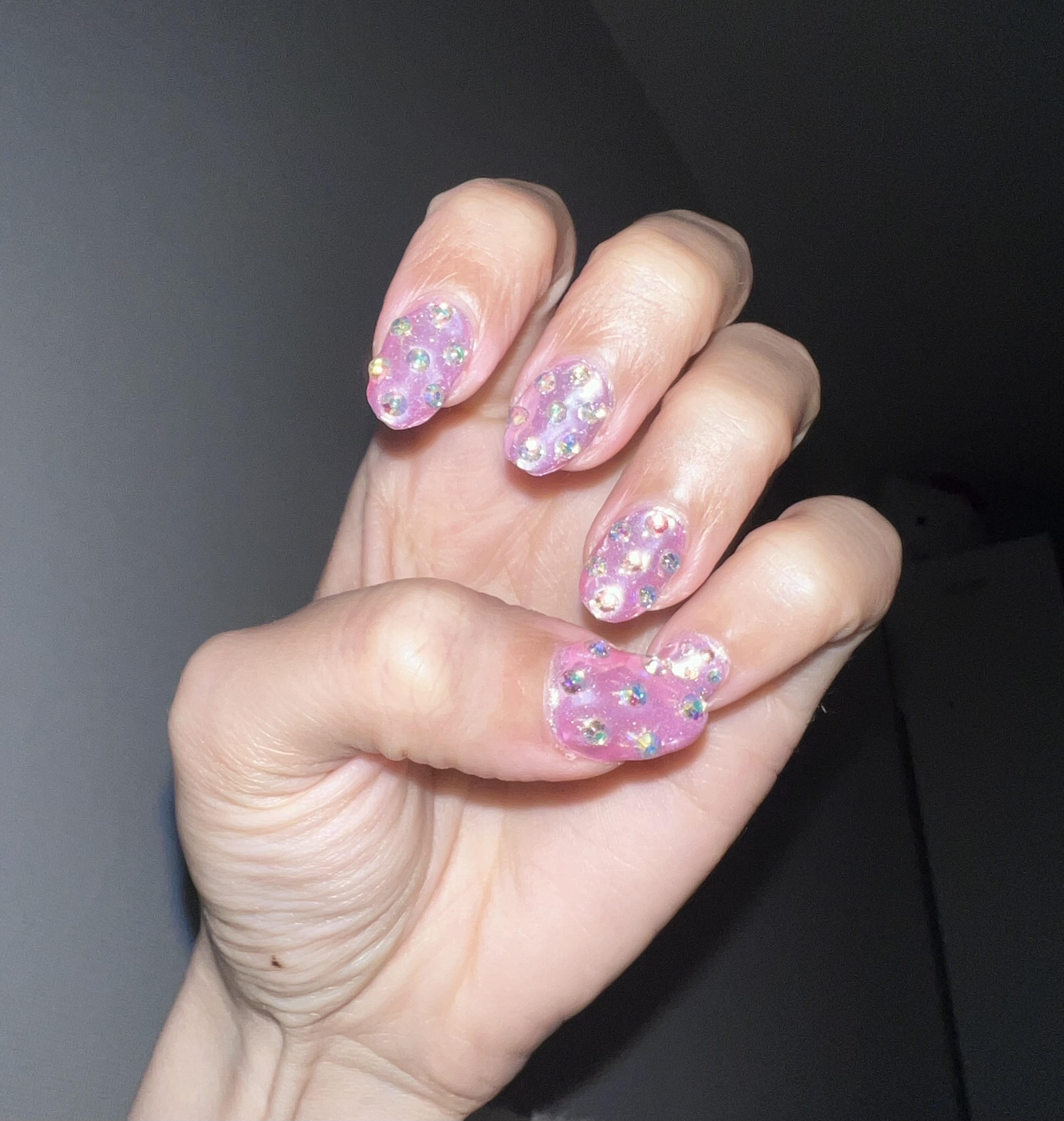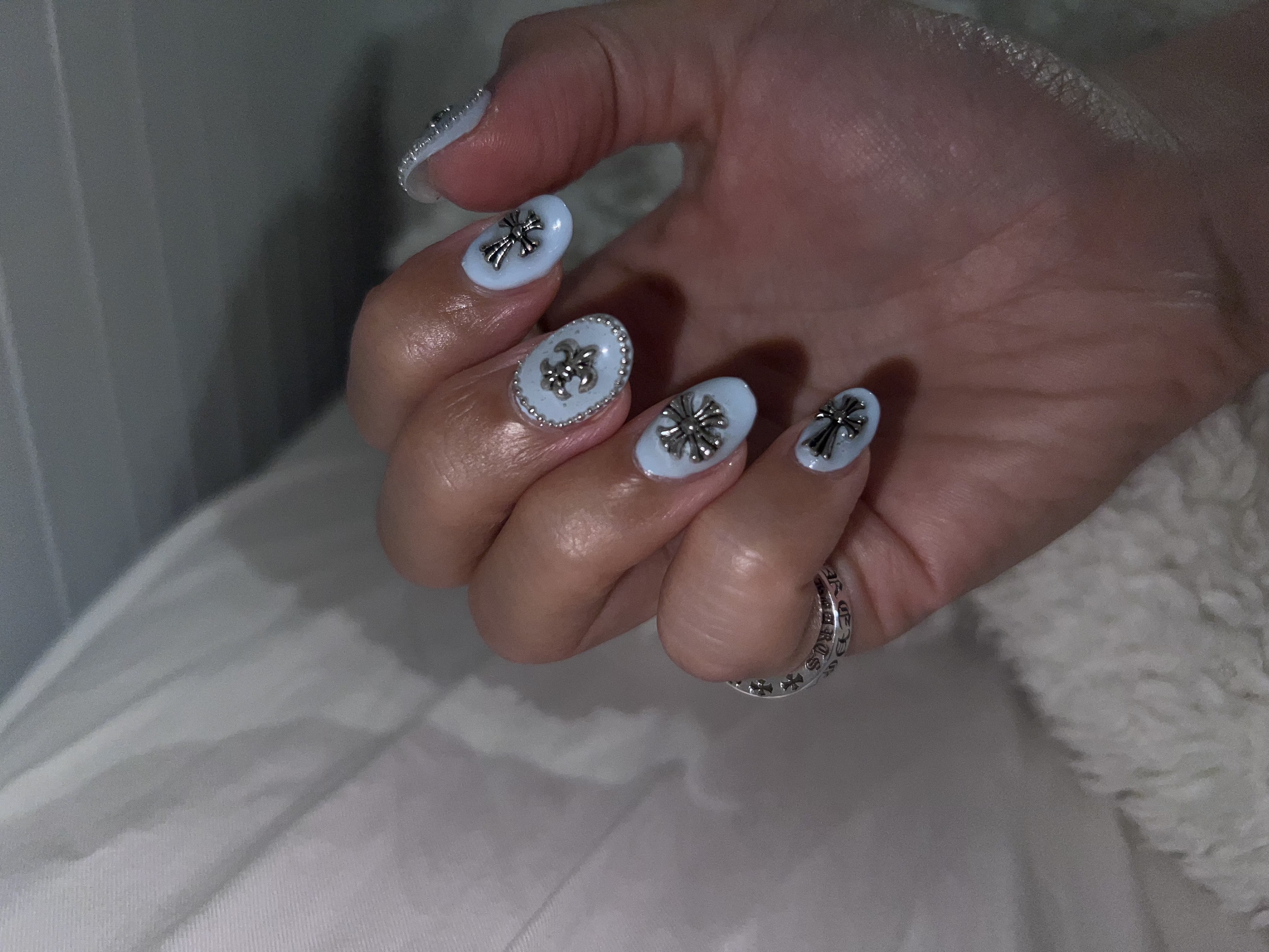 セルフネイル🩵 KEI Beauty 作成日: 2025.10.3 お出かけの予定もないし暇だったのでセルフネイル!!!左手はピンクにパウダーのせてキラキラにしたよー🪞💗右手は水色に🩵クロムみたいなパーツ☝🏻気泡入ってるけどまあ見ないフリすれば問題なしです🥹皮膚にもついてないし上手く出来たと思う!