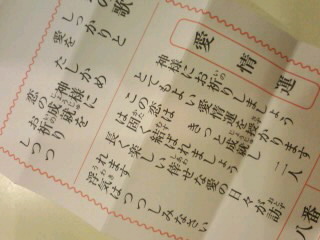 →恋みくじ📷 miku Diary 作成日: 2009.12.5 さっきみれいとあやと恋みくじ行って来た みくO型が1番合うしO型がいぃのになんでAかB‥ 4・5歳差がいいねんて!確かに 良縁の話が、身近な人より遠からずあります。やってさぁー! 誰かが運んでくるんかな 結婚わ理想じゃなくてもいい相手に出会えるってさ 大吉やってよかったいい事ありますよぅに Please→Yonda!・comment (C)M!KULOG