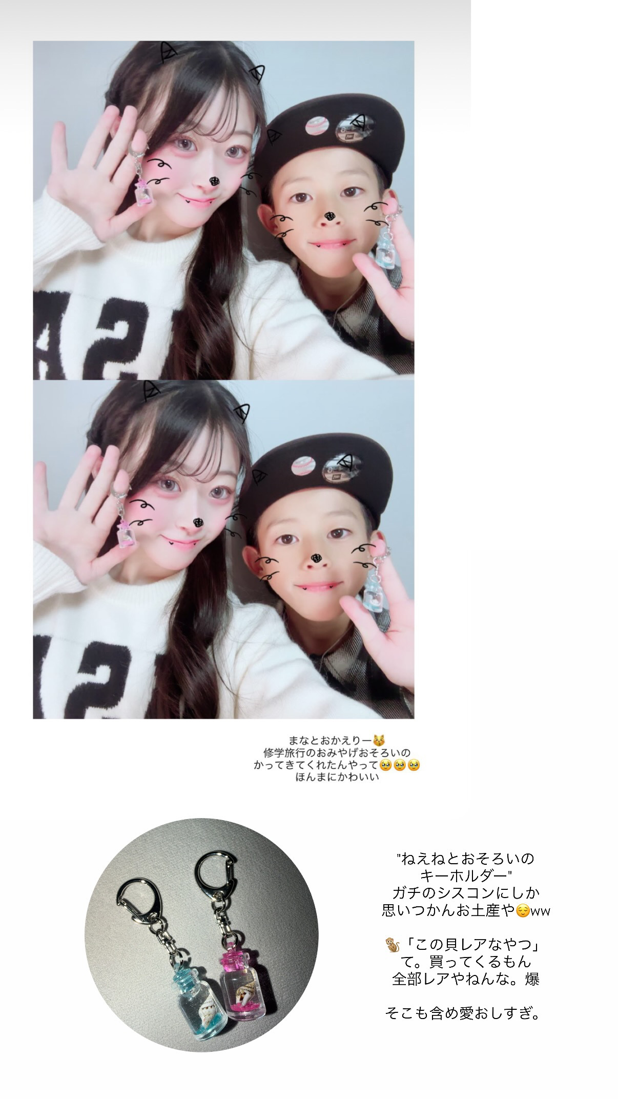 末っ子の優しさ🐒 RISA Diary 作成日: 2025.11.22 修学旅行から帰ってきた末っ子ちゃん。ねえねにはおそろいのキーホルダーと、わたしにはパールのネックレスうれしいな〜かわいいな〜て、思ってたけど次の日スーパーで同じクラスの女の子のママに会って「まなとくんママにお土産選んでたって聞いて感動しちゃって〜🥹」て、先生からも一番時間かけて選んでたって聞いてたから愛おしさ爆発よね。宝物です💎末っ子が次中学生とか信じられへんけど(誰が見ても見えなさすぎるww)うちの男組はほんまに優しいんよな🥹しあわせです🫶🏻🩷