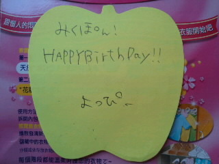 birthday present #1 miku Diary 作成日: 2011.8.12 from よっぴー 台湾土産と別に、コレ↑↑↑頂きましたぁー (^_^) めっちゃくちゃいいにおいっ こんなメッセージも。。 年下やのにいつもイジってごめんねっ ♪ ありがとっ よっぴ