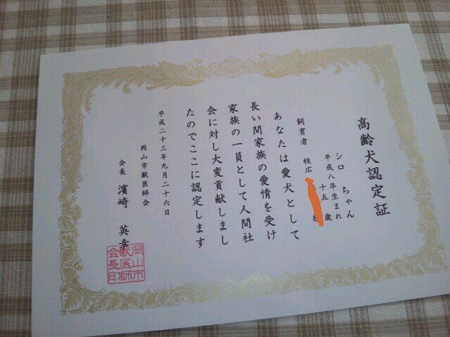 しーちゃん miki Diary 作成日: 2011.10.6 しーちゃん15歳だから賞状きた みきと同じ10月生まれ★ しーちゃんとは人生の半分以上一緒 散歩は毎日おばあちゃんに任せきりだったから今日帰ったら行ってあげよっと 長生きして