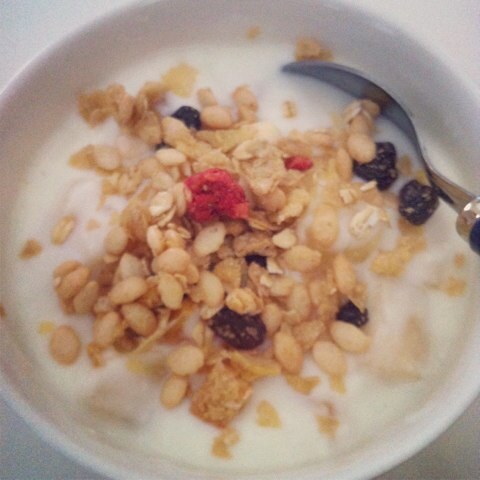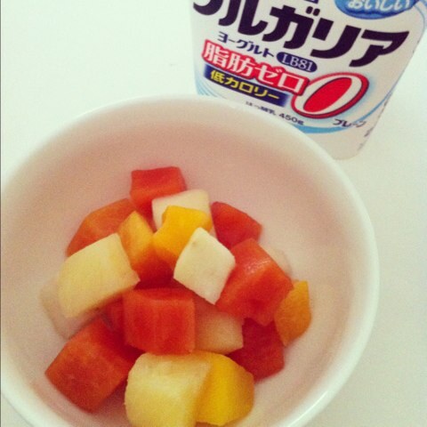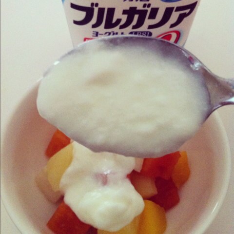今日ゎコレ★ miku Diary 作成日: 2012.5.4 最近朝ごはんによく食べるフルーツ×ヨーグルトに、今日ゎシリアルも入れたょ野菜ジュースも一緒に飲んでたんやけど、最後らへん食べて飲んでってするの面倒くさかったから野菜ジュースも一緒に混ぜた!(笑)なんでも混ぜちゃう癖がある。おいしかったぁぁー。