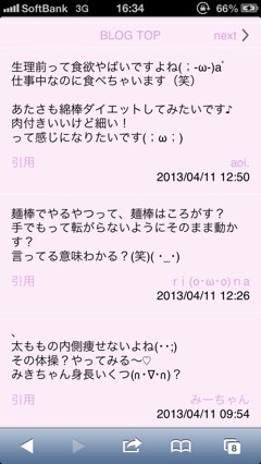 こめへん( ^ω^ ) みきてぃ Diary 作成日: 2013.4.11 ✉あおいちゃん✉ わかるわかるーっなんでかなあっ?みきも、チョコ食べすぎて、反省中((.;゚;:Д:;゚;.))綿棒きくよ☆むくみがとれて、ちょうどよくなるかも ✉りなつん✉ 理解した!笑動かさないように?回らないように?やってるよ ✉みさきちゃん✉ みき148センチなんだよ終わってる( ^ω^ )笑