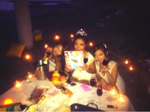 白いでっかーいテーブルクロスの上に花散らしていーーっぱいのキャンドルちりばめてワインとワイングラス、ケーキ、フルーツ、生ハム、チーズ、クラッカーとかオッシャーなテーブルセッティングするために