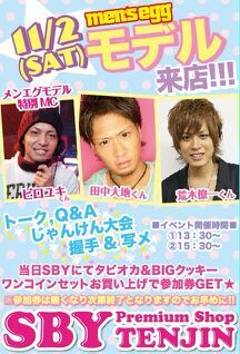 11月2日にSBY天神コア店でmen's eggモデルの田中大地くん、荒木遼一くん、ピロユキくんの来店イベントを実施します!