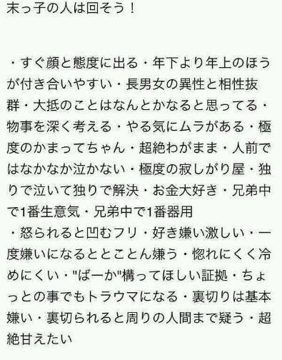 末っ子あるある AYA..E Diary 作成日: 2013.11.6 ドンハマりちょーーーー、当たってるWゆいつ違うのわ一人で泣いて一人で解決大抵のことはなんとかなると思ってるお金の事わなんとかなるとおもって生きてるがそれいがいわどーにもならない!!!!笑それに一人で泣きません笑