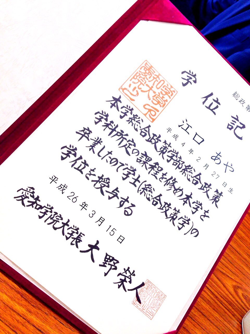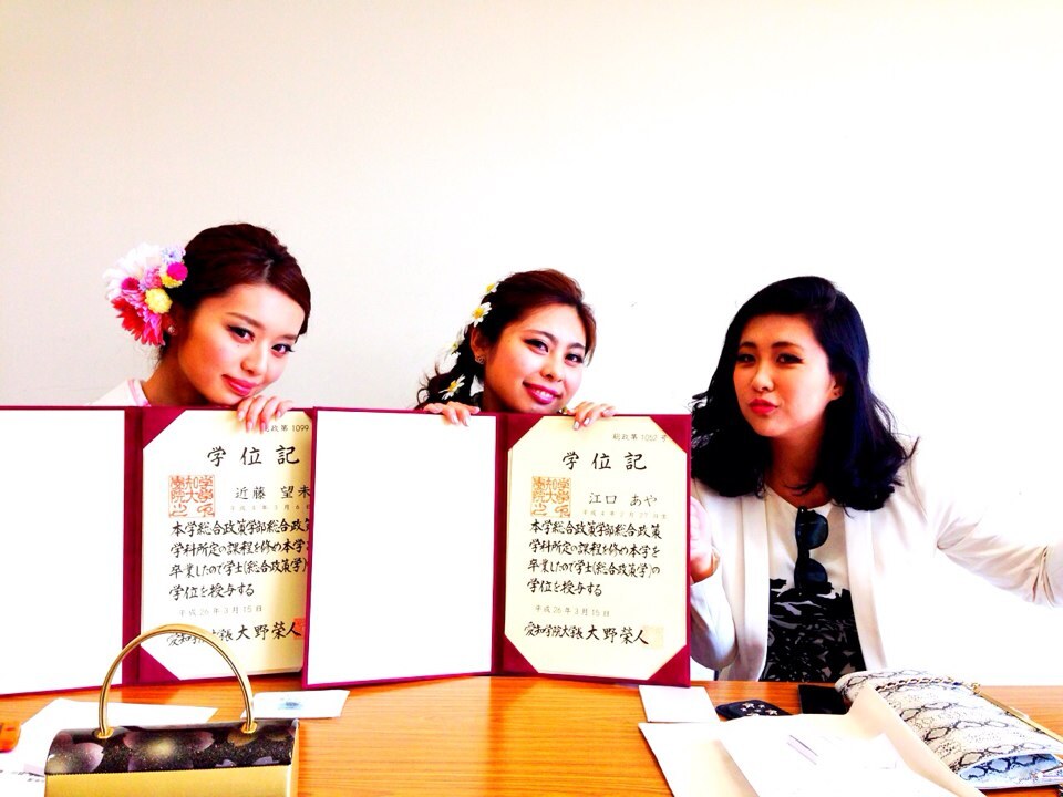 卒業式6 AYA..E Diary 作成日: 2014.3.18 やっと12時になって竹市ゼミ♡卒業証書もらっちゃったー♡竹市先生ありがとう♡今日で最後って悲しかったな謝恩会来れないってうぅー天下のGgirlじゃ♡♡♡うちら食べ物と酒はいると無敵だよ♡♡♡まだまだ楽しい時間わつづくぅー♡♡