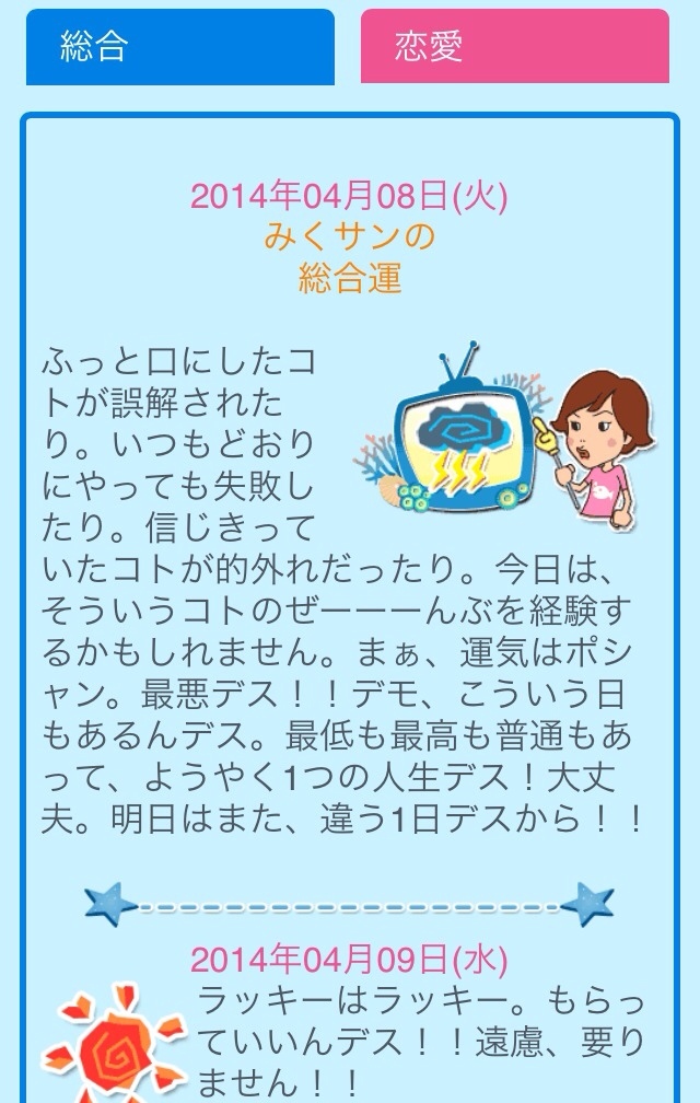 今日テレビに。。 miku Diary 作成日: 2014.4.8 魚ちゃんが出てたねー😁😁発言が本当に面白い💓💓そして本当に当たるんよなー笑ココから、魚ちゃんに占ってもらえるよ💓[PR]http://dclog.jp/en/6105018/539871990ぜひ💓💓ちなみに私は今日。。運気はポシャン。。笑最悪みたいです。😱😰😥💦💦
