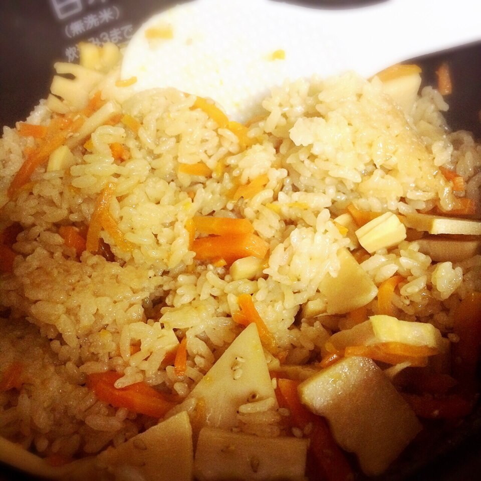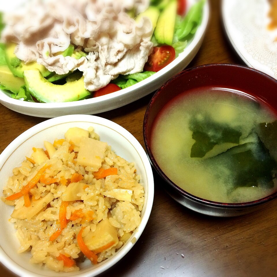 華子ごはん♡たけのこ炊き込みごはん 野田華子(のだ はなこ) Diary 作成日: 2014.4.16 撮影なうだよー!バタバタ昨日の夜ごはんは、八百屋のおじちゃんにごり押しされた笑柔らかたけのこを使って炊き込みごはんと、たけのこと鳥肉と青梗菜と玉ねぎの炒め物。味付けはニンニクと生姜とバターと醤油と酒〜!あと冷しゃぶサラダとアサリのお味噌汁でーした!