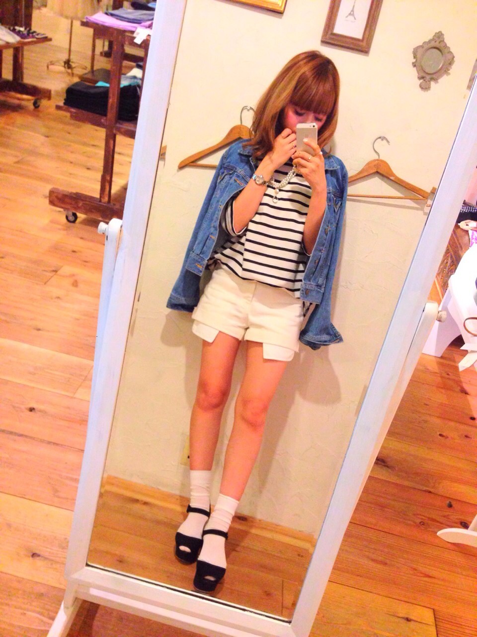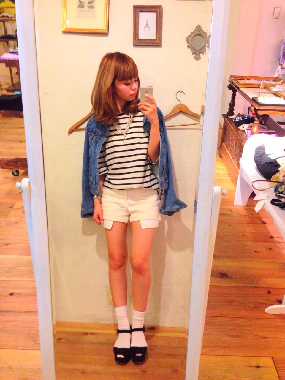 購入品とcode miki Diary 作成日: 2014.4.23 今日は、久しぶりの姉妹会で夜遊びして楽しかったぁ(´౿`) 昨日の購入品♡♡♡sugar先輩のblogから拝借♡新作のホワイトデニムショーパンを早速今日履いた( ´ ▽ ` )ノ何だか、、脚が、、細く見えるーーー!喜ボーダーtopsは入りたての頃に買ったやつを引っ張り出した〜(´౿`) 眠い!寝る(ΦдΦ)