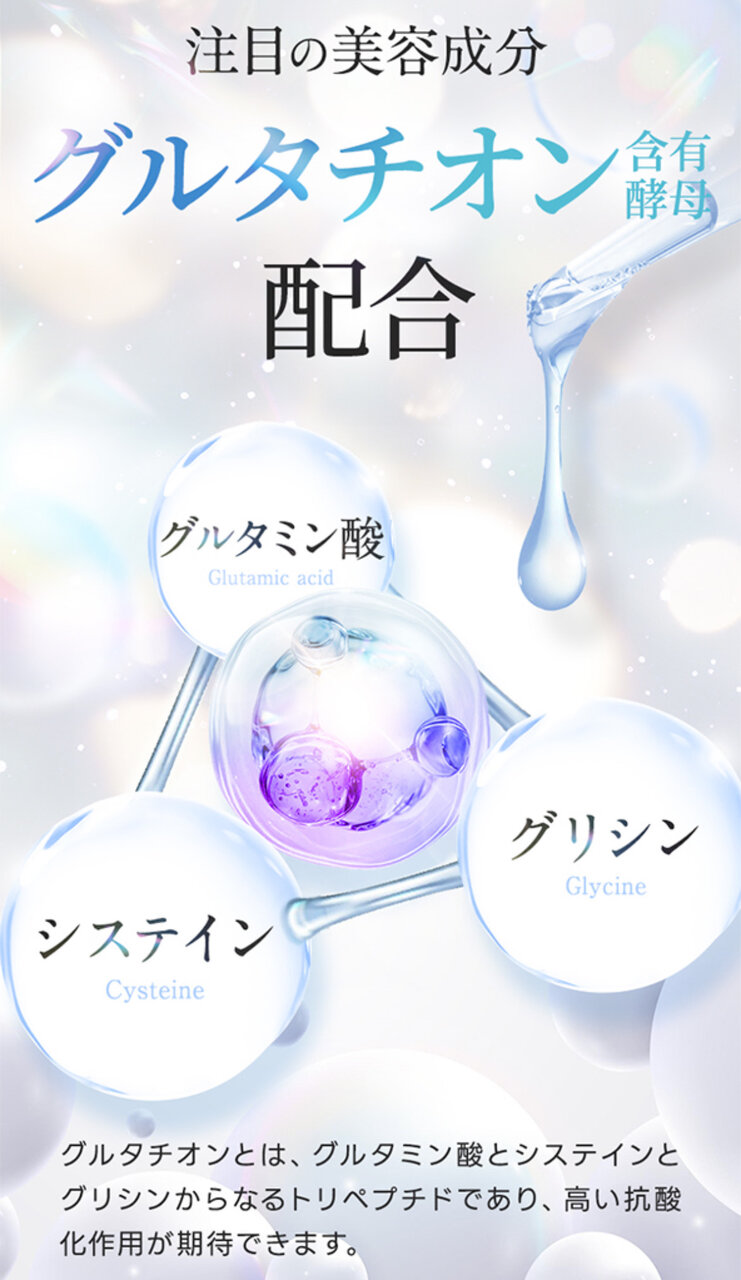 注目のアミノ酸「グルタチオン含有酵母」を3,000mgと高濃度配合。さらに、美容と健康を支える「ビタミンC」と「13種類の厳選美容成分」を贅沢にプラス。
