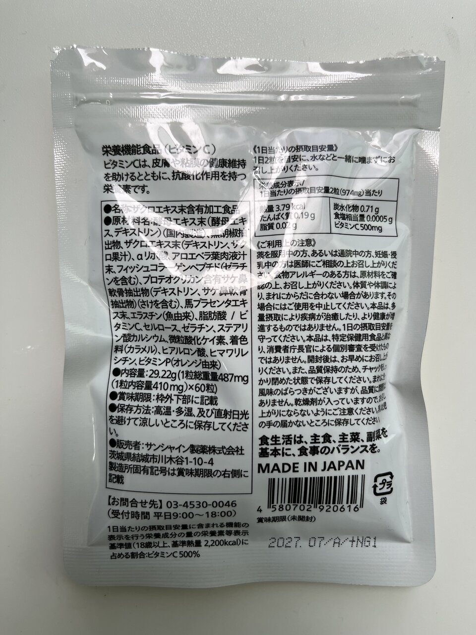 他にも美容成分が配合されていますが、このくらいの量であれば、ビタミンCだけでももっと入っているサプリメントでも良いかなと思います。