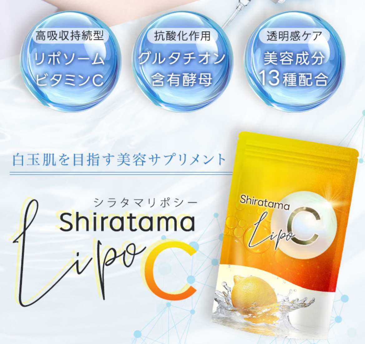 白玉リポCはリポソームビタミンCと白玉点滴成分グルタチオンを同時摂取できる美容サプリメントです。