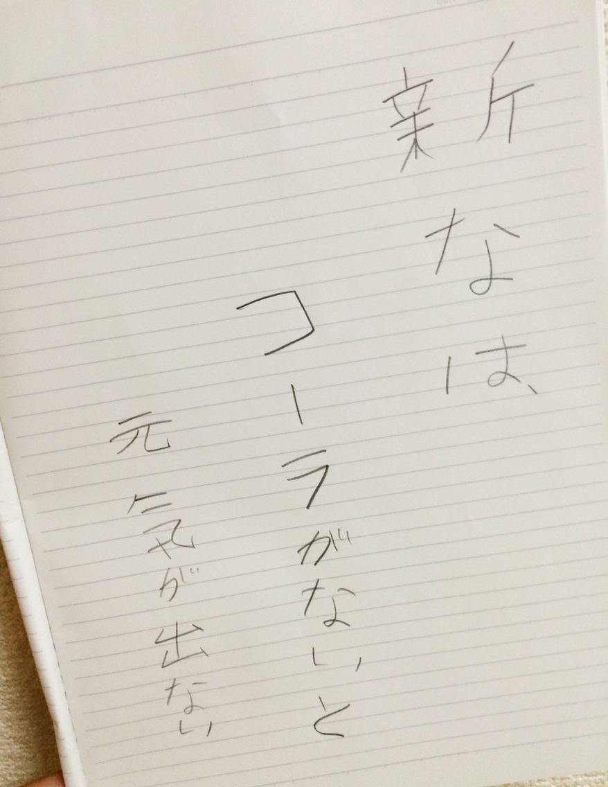 メッセージ 野田華子(のだ はなこ) Diary 作成日: 2014.11.2 新菜からの謎のメッセージw、(新菜の菜はまだ習ってない模様w)これは最近怪盗ジョーカーにハマってる新菜からの暗号?!それともコーラを買えっていうただの要求か…間違えなく後者ですよね。はい。爽健美茶は飽きたそうです。はい。しかし字が雑!笑