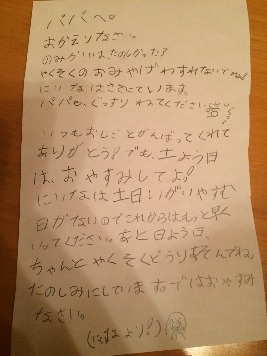 寝る前に書いたにいなからの置き手紙。