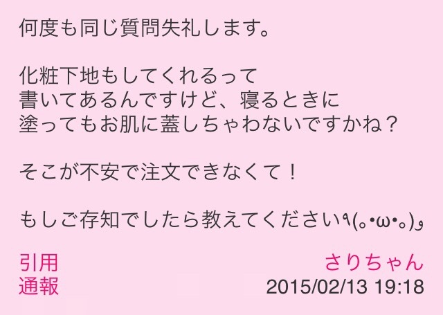 なので、スキンケアとして夜につけてもコスメのような皮膚呼吸の妨げになる蓋ではなくて、水分をお肌に閉じ込めてあげる保湿パックの蓋の役割になるので心配しないで下さい(*^^*)