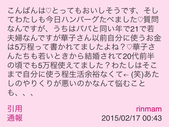 22歳からは雑誌の仕事で服やコスメが必要だったのでそのくらいでしたが、結婚した19〜22までは自分のお小遣いは1〜2万でした。