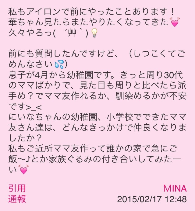 「出会った当時は華子は19歳でこっちは33歳だったからかなり年の差って感じたけど、もう20超えたらママ同士だとあんま年の差って気になんない(*^^*)」