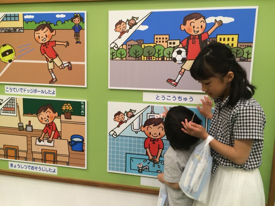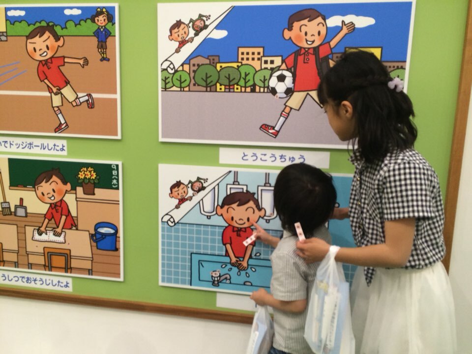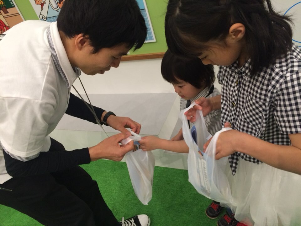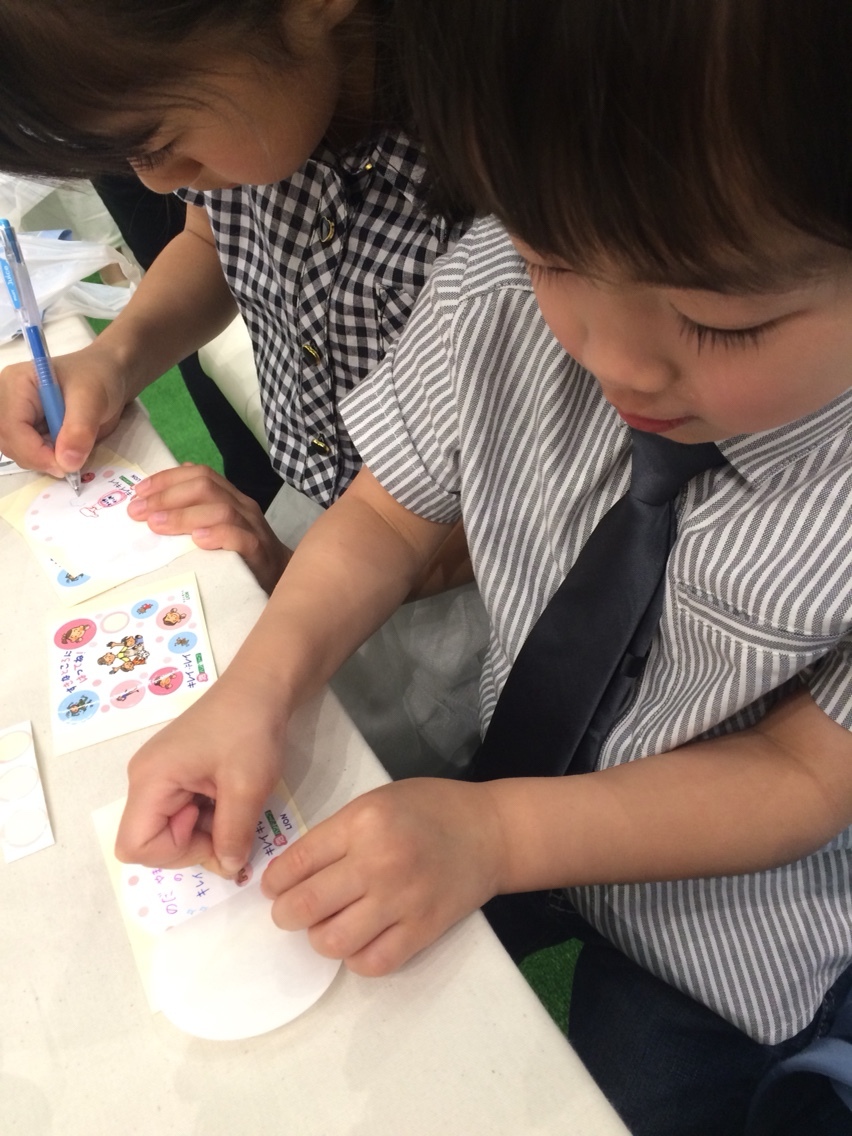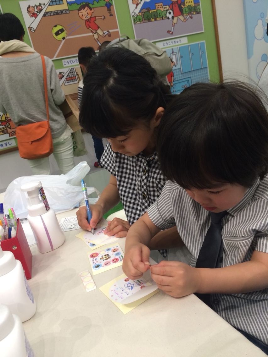 子ども達に「どこにバイキンさんがいるかシール貼ってみて〜!」