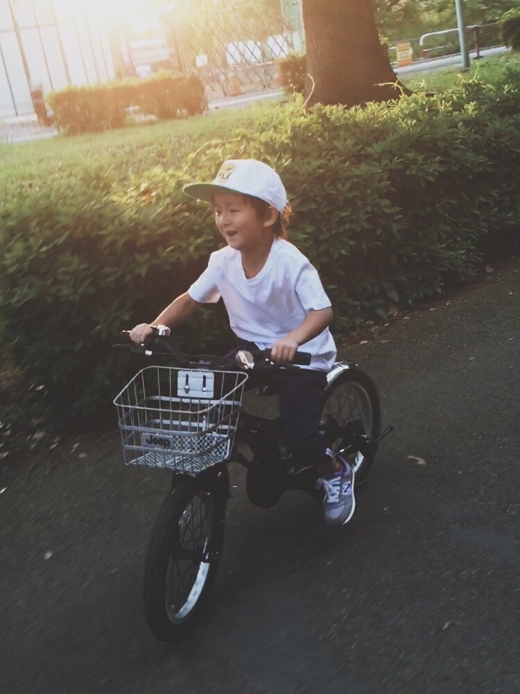 自転車は4歳の誕生日に祖父母から買ってもらったjeepのグリーン 16インチだよ!