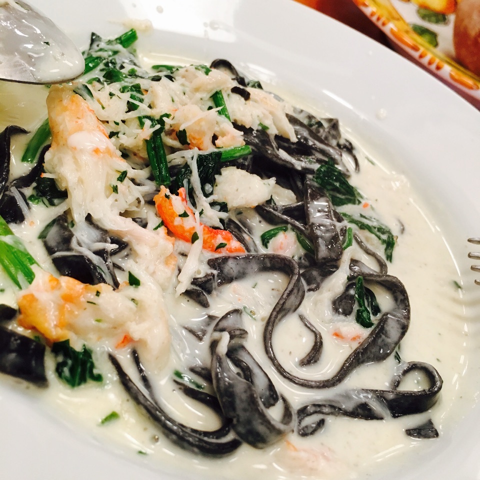 麺わ平打ち麺で黒すみが練りこんである黒い麺