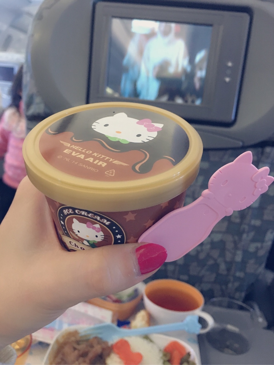 台湾到着✈️ miku Diary 作成日: 2015.12.4 びっくりするくらいキティちゃんで埋め尽くされた機内だった✈️搭乗前にごはん食べてしまったのちょっと後悔🙄アイスおいしかった🍦💞今からホテルへ向かいます🚕