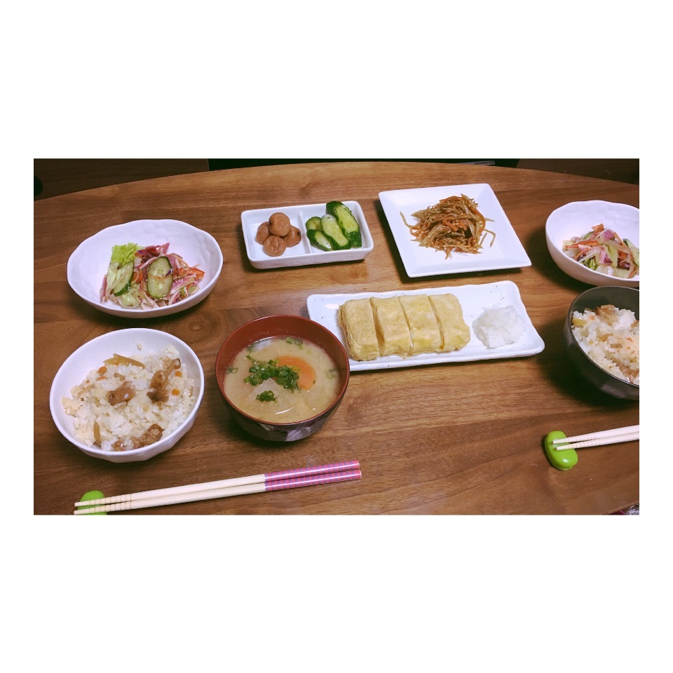 冷蔵庫のお掃除🙌🏻 miku Diary 作成日: 2016.1.9 残ってたサラダと、ごぼうとにんじんもまだ余ってたのでまたまたきんぴらに💗大根もまだ余ってたのでお味噌汁と大根おろしに。あと彼のいとこがお土産でくれた混ぜるだけの炊き込みごはん🍚楽チンらんちでした🙏🏻💗またスーパーで買いだめしないと❗️今日は久々に内見👀その前に少し休憩。。🍵