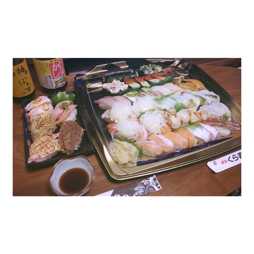バカな彼🙄🙌🏻💜 miku Diary 作成日: 2016.1.19 彼がくら寿司お持ち帰りして帰ってきてくれました🐰❤️その量にビックリ❗️お箸5本入ってたから5人前くらい?持って帰ってきたのかな😨ほんと彼の底なし胃袋にはビックリさせられます😨彼が愛してやまないかけしょうゆと柚子ぽんずで、頂きました🐰👏🏻私は普通のお醤油❤️くらのシーフードサラダが大好き🙄💕あーお腹いっぱい❣❣ごちそうさまでした🙏🏻💚