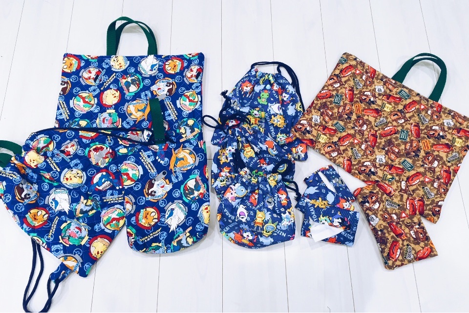 こういう巾着とか袋や今保育園で使ってるコップや箸、お弁当セット一式、タオル、パジャマ、下着は全部キャラ。笑