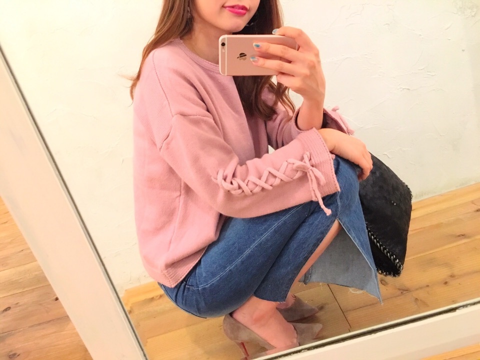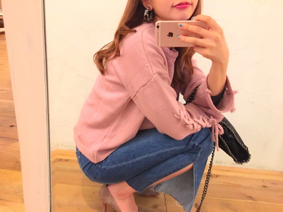 昨日💘coordinate miki Diary 作成日: 2016.11.7 昨日のcoordinate💗💖💘ニットが可愛い〜♡♡♡袖のレースアップが可愛いしくすみピンクの色味も可愛いなぁ💖よし、次のネイルはくすみピンクにしよう☺︎ボトムは、aries オリジナルのスリットデニムだよ〜☺️✨予約販売も終わって、今週末にweb入荷致します٩(◜ᴗ◝ )۶ 今日は帰る間際に、癒されたな〜✨🍌✨勉強ファイトだーー( ; ; )また息抜きしに来てね、、♡