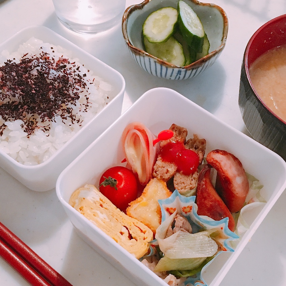 お弁当 🍙 miku Diary 作成日: 2017.5.16 手抜きな お弁当 🍱私は お味噌汁 に 漬け物も 。パパより 贅沢な お弁当 ❤︎いつも 夜ご飯と一緒にお弁当 のせてたけど楽しみが無くなるから やめて !と言われたのでお弁当見終わってるだろう 時間にあげました 。 笑お昼寝したら公園 行こ 〜 っと 🌴Instagram ❤︎ http://instagram.com/miku_8639