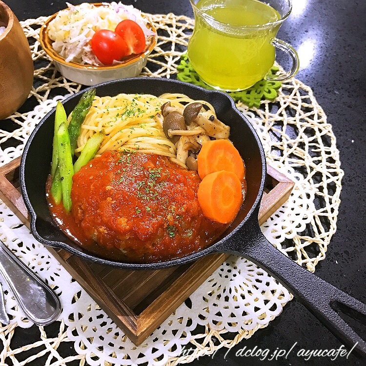 *トマトソースハンバーグ* Ayu Diary 作成日: 2017.11.17 トマトソースハンバーグ🍅旦那が大絶賛してくれたハンバーグ👏🏻👏🏻👏🏻パン粉がきれてたからパン粉無しで作ったんだけど全然大丈夫だった〜(´∀`*)けどかさ増しできない…笑パスタは軽く味付けしてあるけど、トマトソースに絡めて食べたらまた美味しい(๑>◡<๑)❤︎