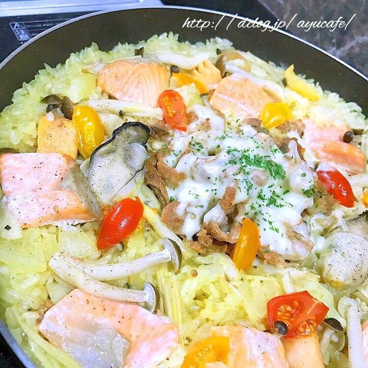 冷蔵庫整理メニューなのでミックスパエリアにしちゃいました❤︎