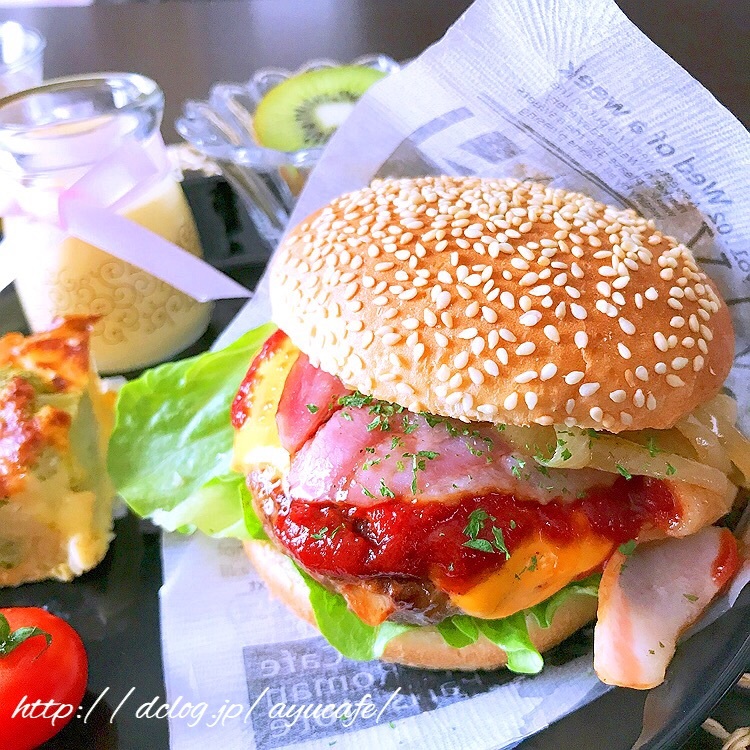 *ハンバーガー* Ayu Diary 作成日: 2018.1.18 きのうハンバーガー用のハンバーグも作って一緒に焼いていたのでランチはハンバーガーに🍔💕ピクルス🥒大好きなのでスライスピクルスたーっぷりいれちゃいました(*´∇`*)♡下からマヨネーズピクルスレタスハンバーグチェダーチーズトマトソースベーコンオニオンソテー