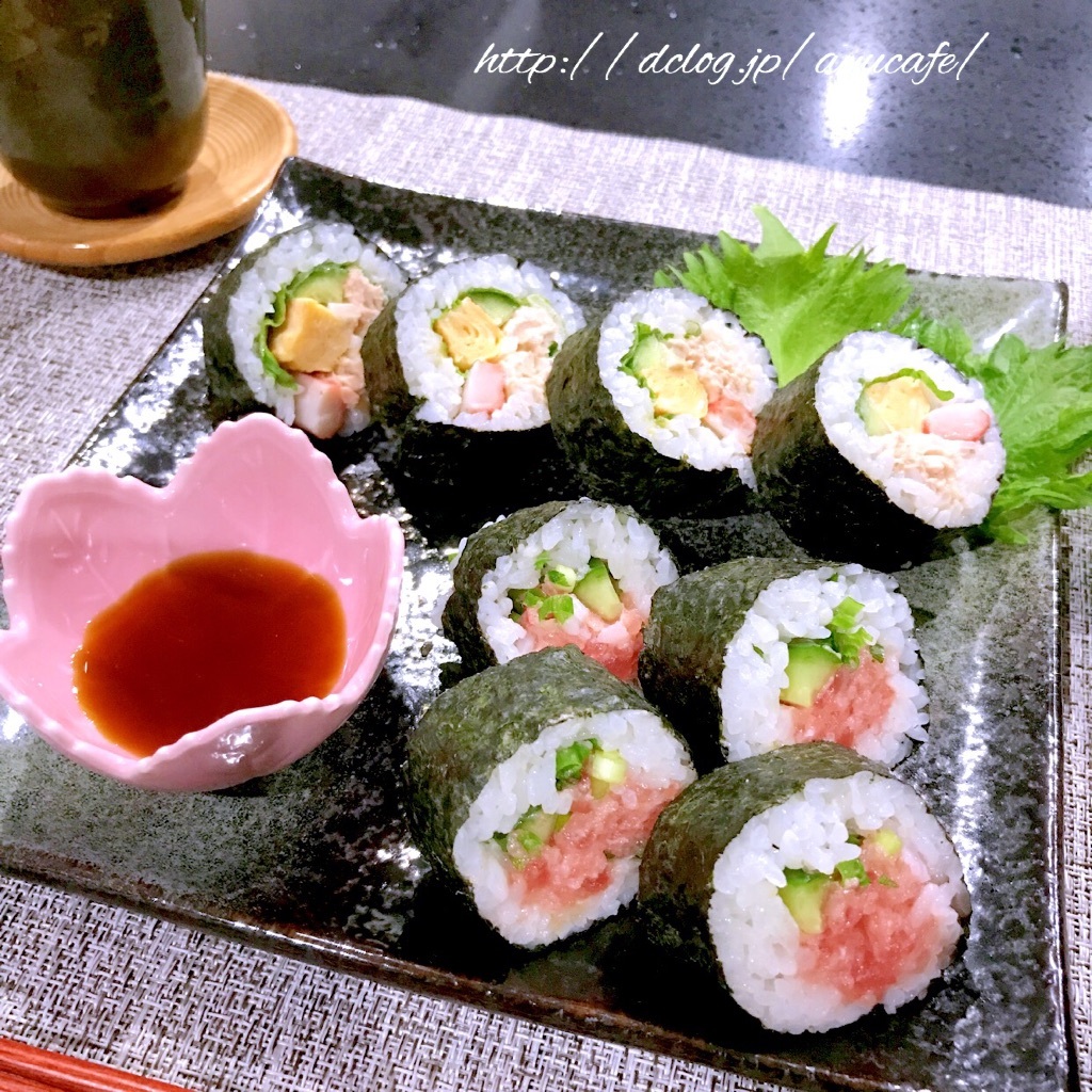 *巻き寿司2種* Ayu Diary 作成日: 2018.1.20 巻き寿司サラダ巻き大葉、きゅうり、たまご、カニカマ、ツナマヨねぎとろ巻きねぎとろきゅうりhttps://www.dclog.jp/en/4911574/571516703