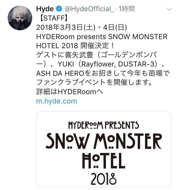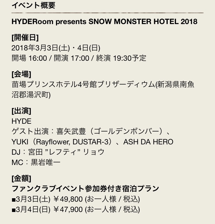 今回はVAMPSとしてのイベントじゃなくてHYDEとしてのイベントだから少し内容は変わるだろうけど、いつものようにHYDEとみんなでゲームしたりHYDEとゲレンデでスノボしたり、夜中のDJタイムもあるし楽しみ!!!😆😆