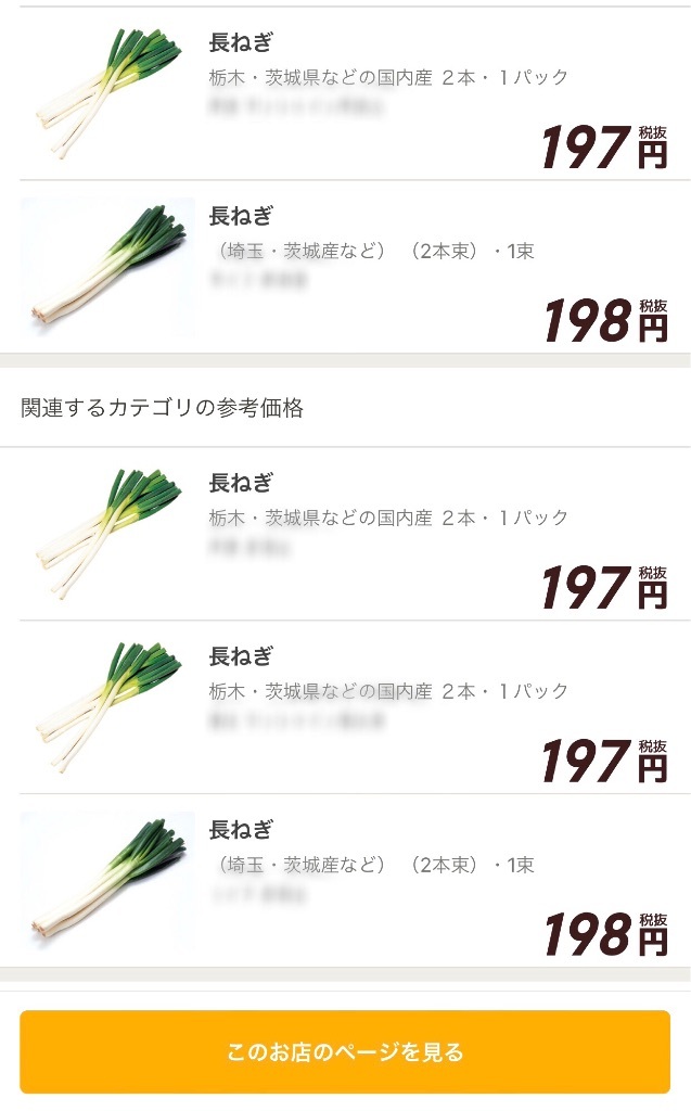 例えば長ねぎを選択したら、フォローのお店以外にもこんな風に参考価格でどこのお店でいくらで今売られてるのかって一覧で分かる!