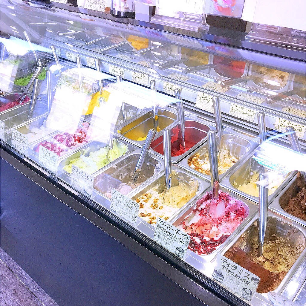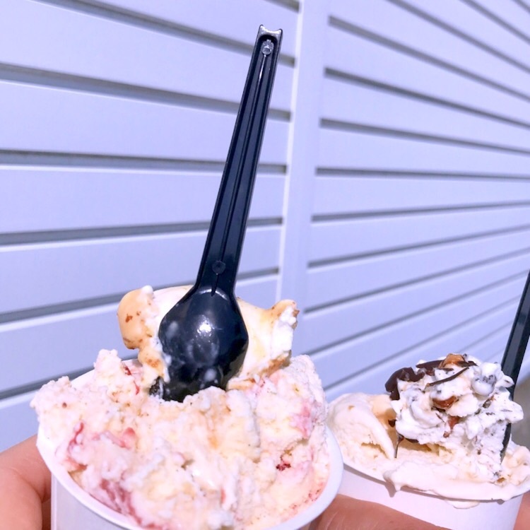 *おまけ付きジェラート🍨* Ayu Diary 作成日: 2018.3.18 ジェラート食べ行ってきた♡おまけで一口別のジェラートを付けてくれるよ😋私は苺ミルフィーユ、おまけはバターキャラメル旦那はメイプルくるみ、おまけはアーモンドプラリネ