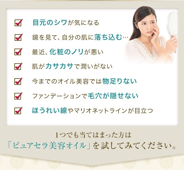 目尻の小じわ、ほうれい線、毛穴の開きや黒ずみ、などなどかなりたくさんの悩みを