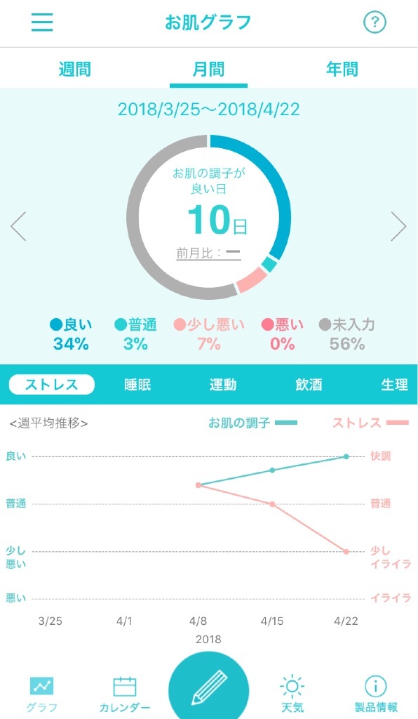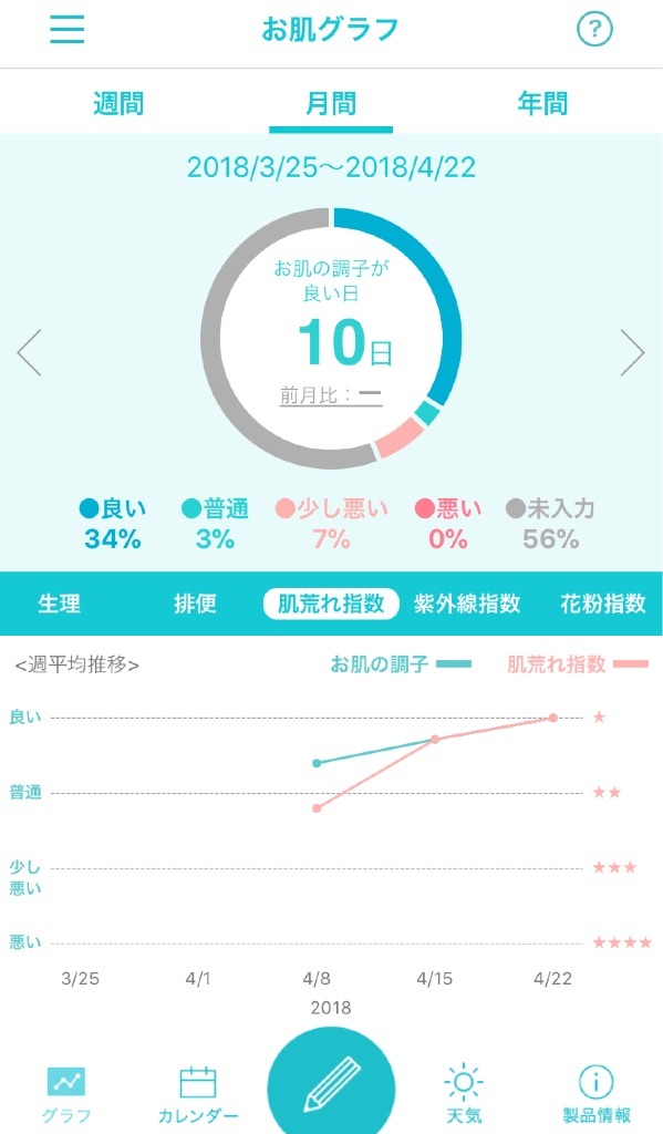 *私の肌荒れ指数* Ayu Diary 作成日: 2018.4.23 Curelの肌手帳でお肌管理毎日続けています👩http://dclog.jp/sa/bkfs_ayu_aa0004毎日記録していくと、お肌の調子や肌荒れ指数が分かりやすくグラフで表示されます✨お肌の調子&ストレスのグラフが同時にグラフで確認できるのですごく便利です^ ^このアプリほんと使いやすくて便利です😊Curel肌手帳(無料)http://dclog.jp/sa/bkfs_ayu_aa0004