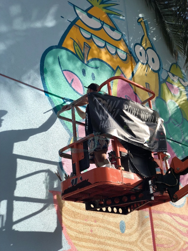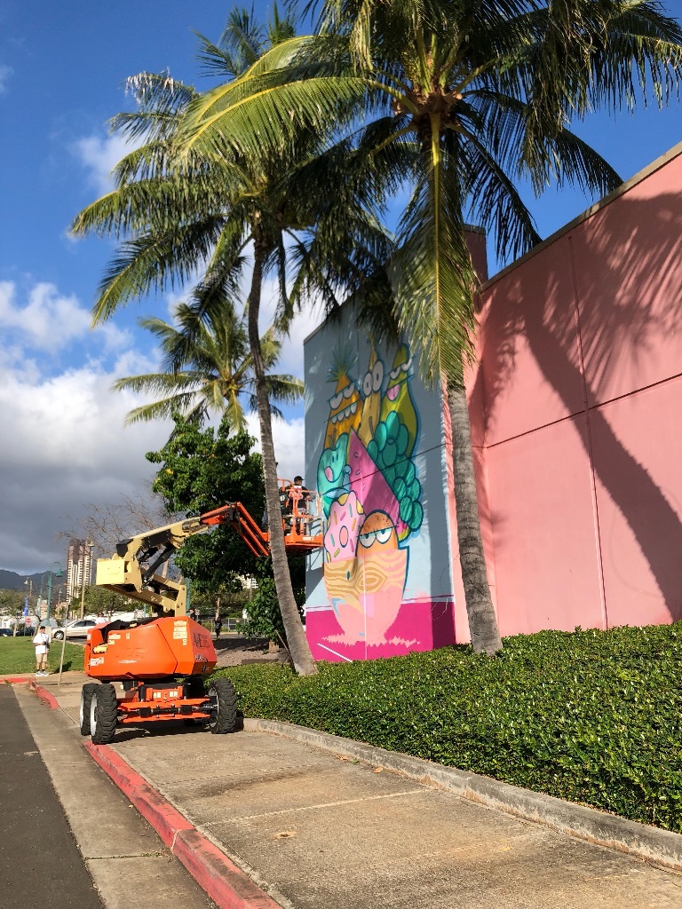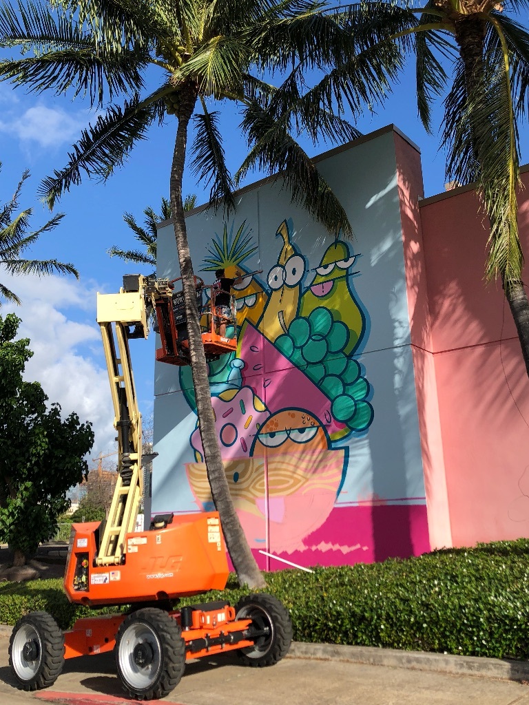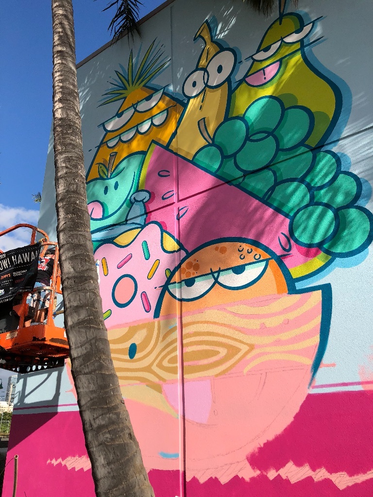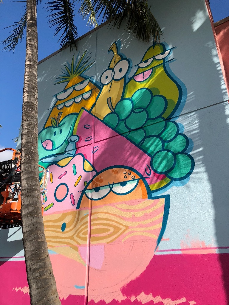 ハワイの有名人👨🌴 まゆまゆ Diary 作成日: 2020.2.16 2月はカカアコのウォールアートを描き変える季節🎨あのモンスターのアートでおなじみのアーティストさんが新しい絵を!たまたま描いてる所に遭遇!これから話題のスポットになること間違いなし。明日くらいに描き終わるみたいフルーツバージョンハワイ最新情報でした