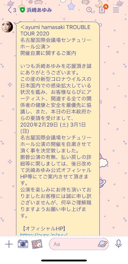 コンサート中止決定? まゆまゆ Diary 作成日: 2020.2.26 この判断は正しいね大阪もないでしょう。自粛すべき気持ちありつつも怖いな〜思いつつもでも、開催されるからには行きたいな!って思っちゃうから。。。いっそ中止にしてくれた方が納得いく。お友達が行く予定だった今日開催のEXILEのコンサートは今日の今日、さっき中止発表されたみたい。無意識に、人混み行く時は息止めたり手すりとか触らないように手をドラえもんみたいにグーにして歩いてる←もちろん意味ないと思うささやかな抵抗