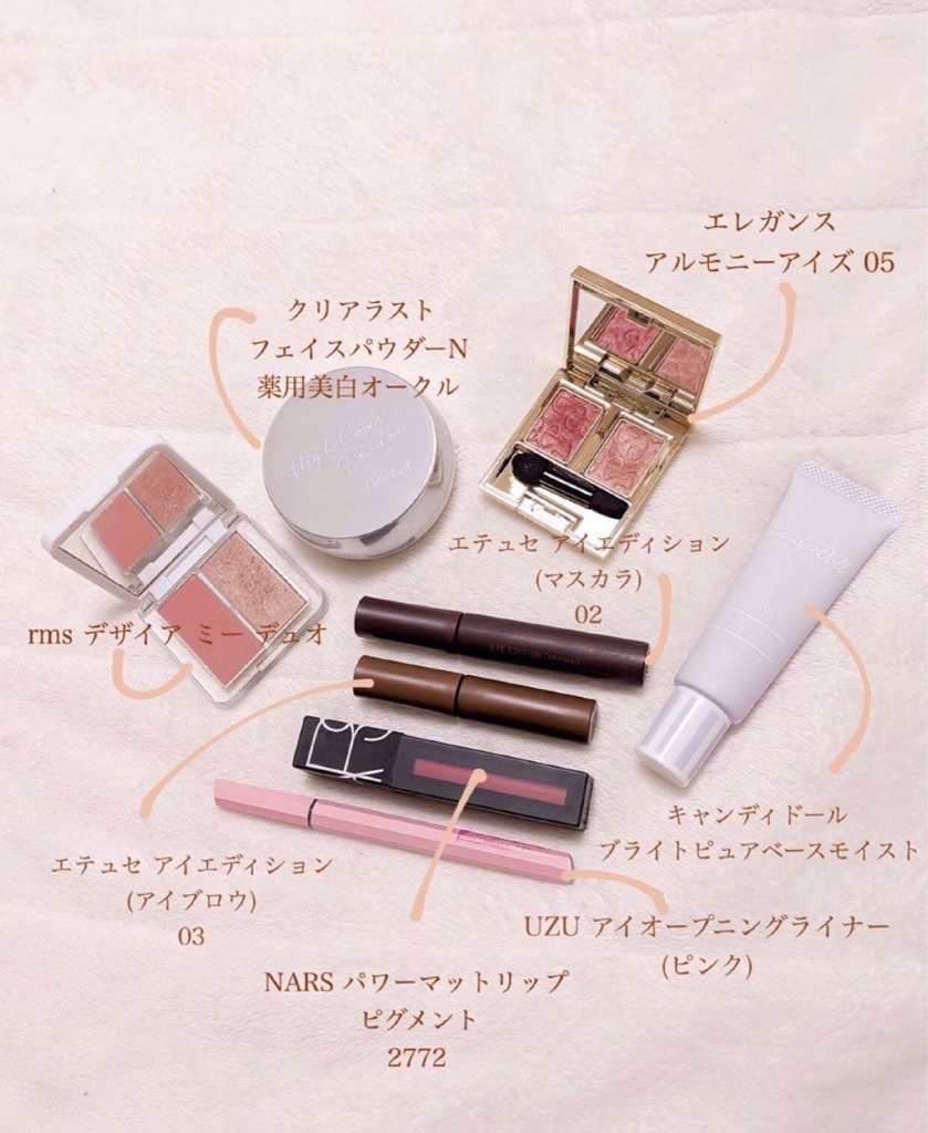最近はこのキャンディドールの下地にクリアラストのパウダーはたいて、エレガンスのアイシャドウエテュセのブラウンマスカラNARSのマットリップ2772