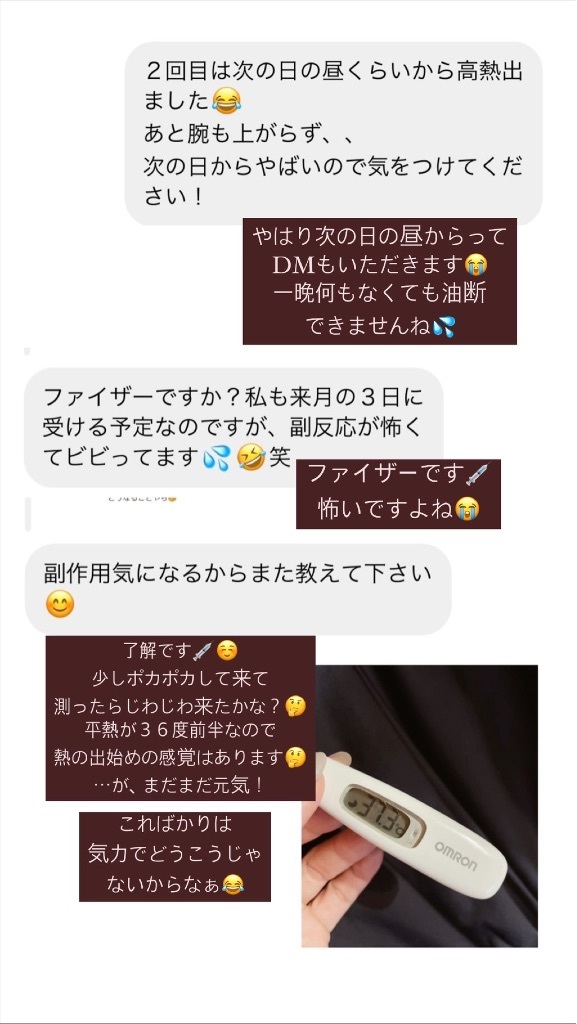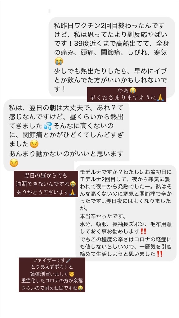 コロナワクチンレポ2回目【ファイザー】1日目 野田華子(のだ はなこ) Diary 作成日: 2021.8.16 ブスリと打って来ました💉15時に打って3時間後くらいの18時少しポカポカしてきたかなぁ?って熱測ったら37.3度だったけどまだまだ普通🤔腕の痛みも22時現在徐々にって感じだけど今のところ1回目より痛くないですここからかなぁ?💦色々副反応のDMいただいてドキドキしております🥶🥶🥶夏用ベルミス発売😍✔️クールテック✔️ウエストまで着圧✔️レギンス🎐夏用ベルミス公式サイト🎐 http://www.instagram.com/noda.hanako
