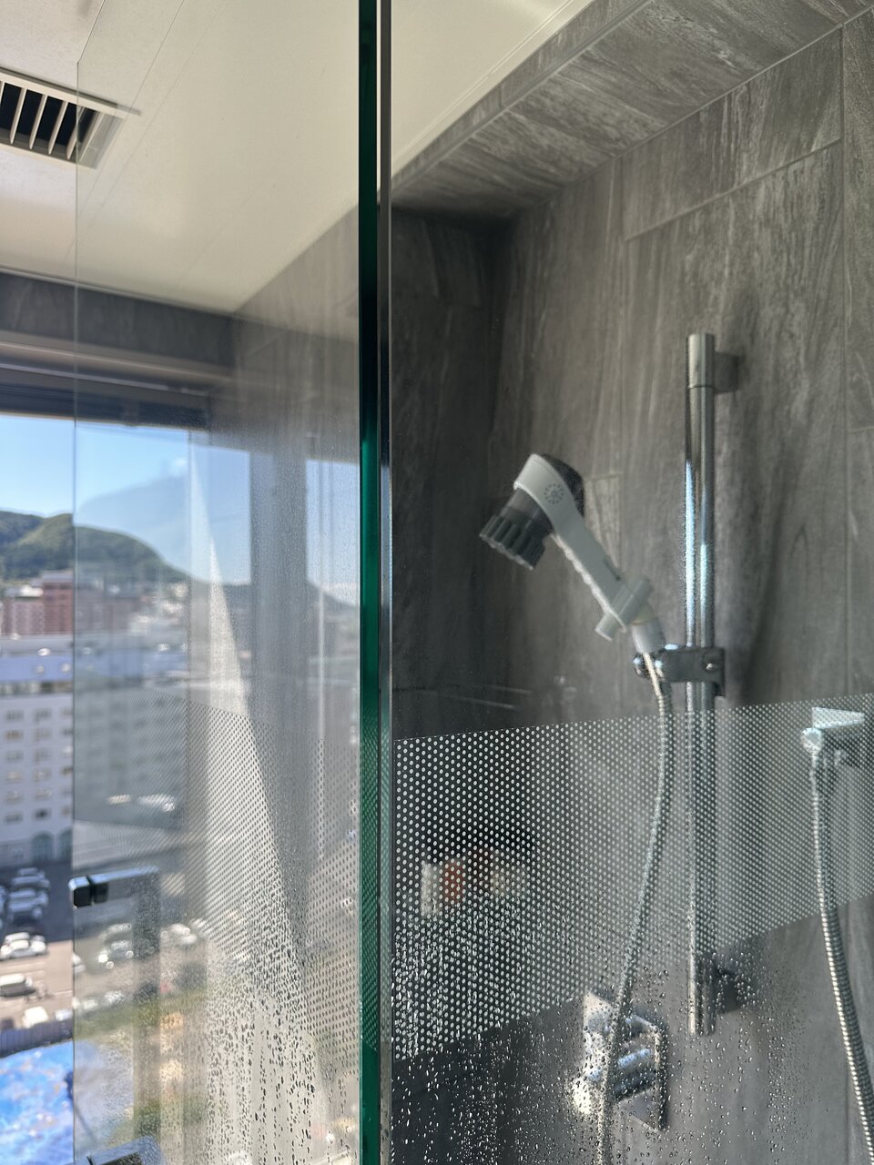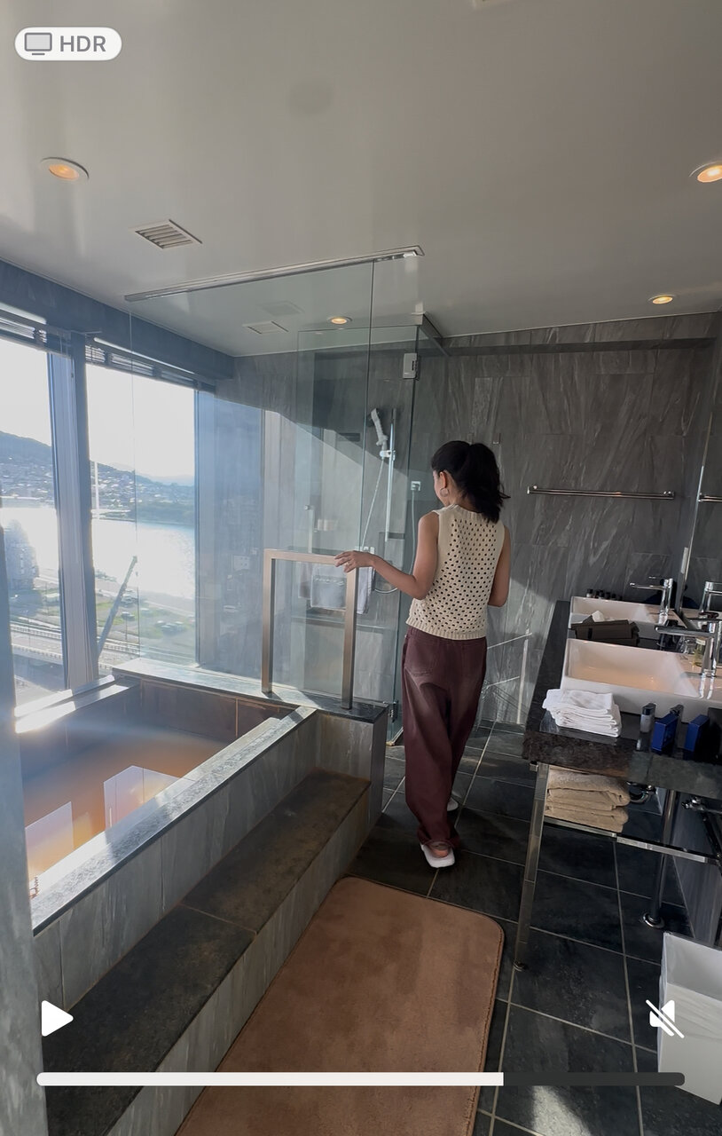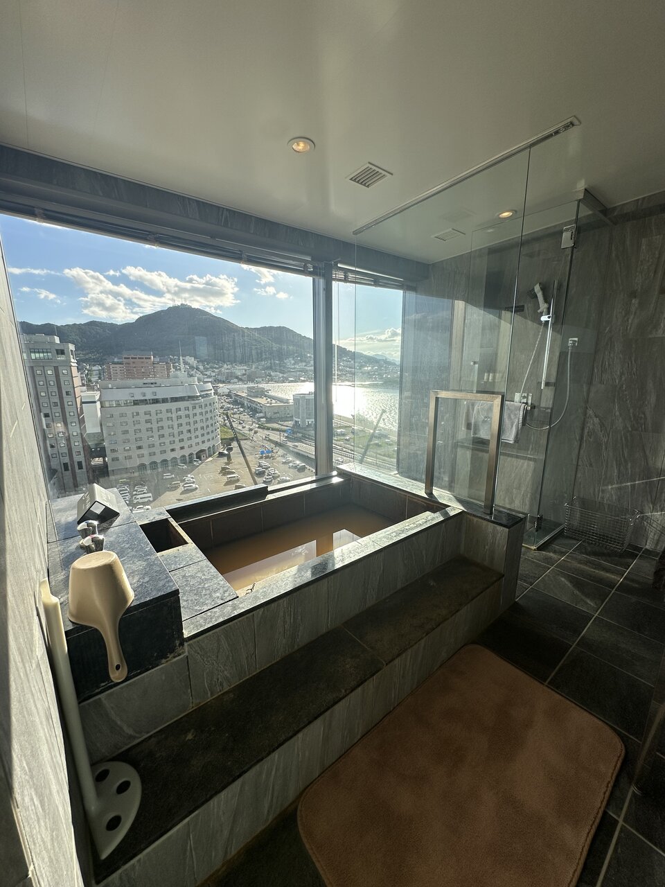 開けていれば"温泉×景色"をたっぷり楽しめて、閉めれば落ち着いた空間に。気分で切り替えられるのが嬉しいポイント♡(シャワー中は閉めて、浸かってる時は開けて景色堪能!)