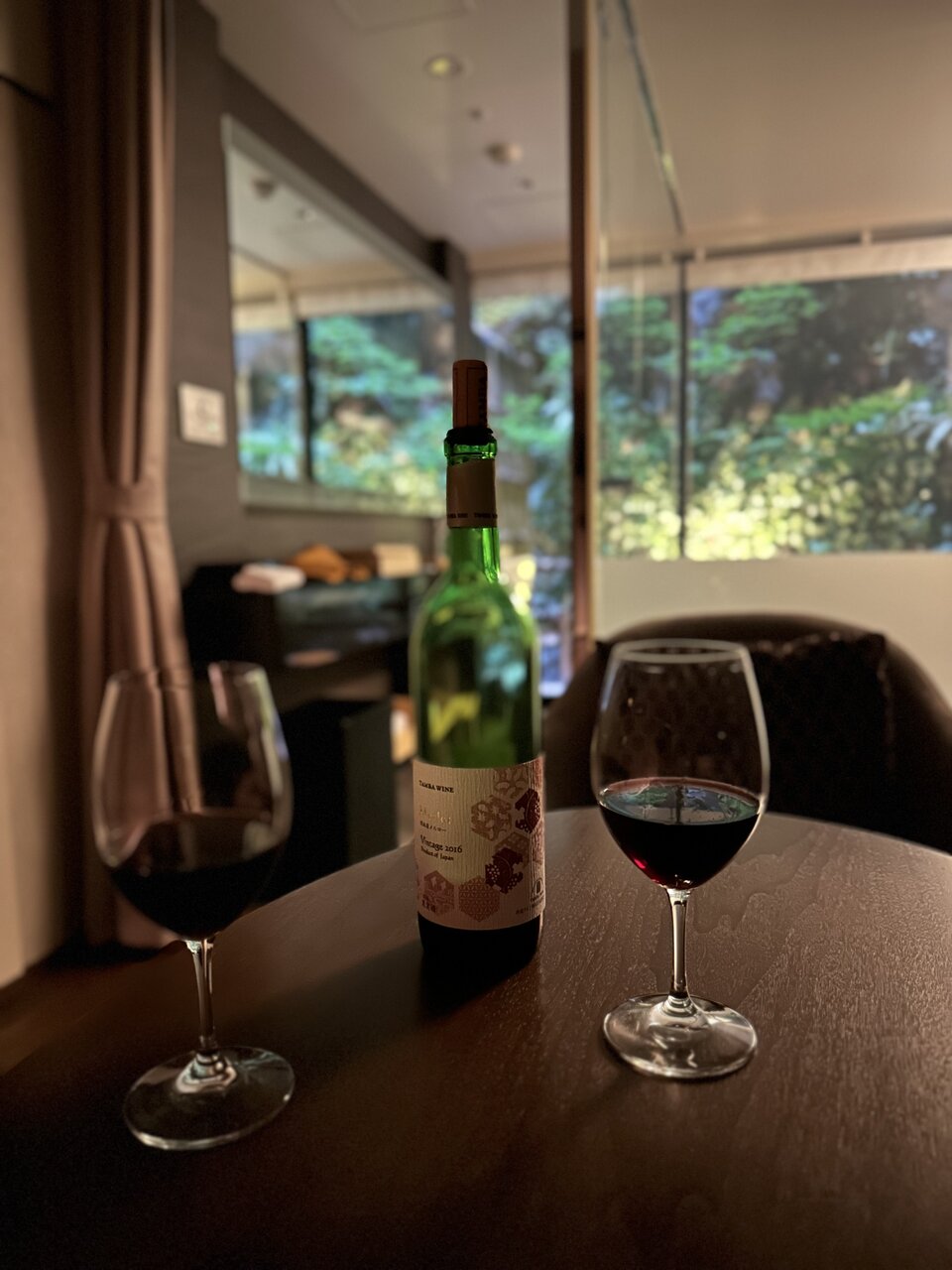 深みのある色合いと、ベリーの香り。口に含むと柔らかな渋みと果実味が広がり、鴨川を眺めながら飲むと最高に贅沢な気分。