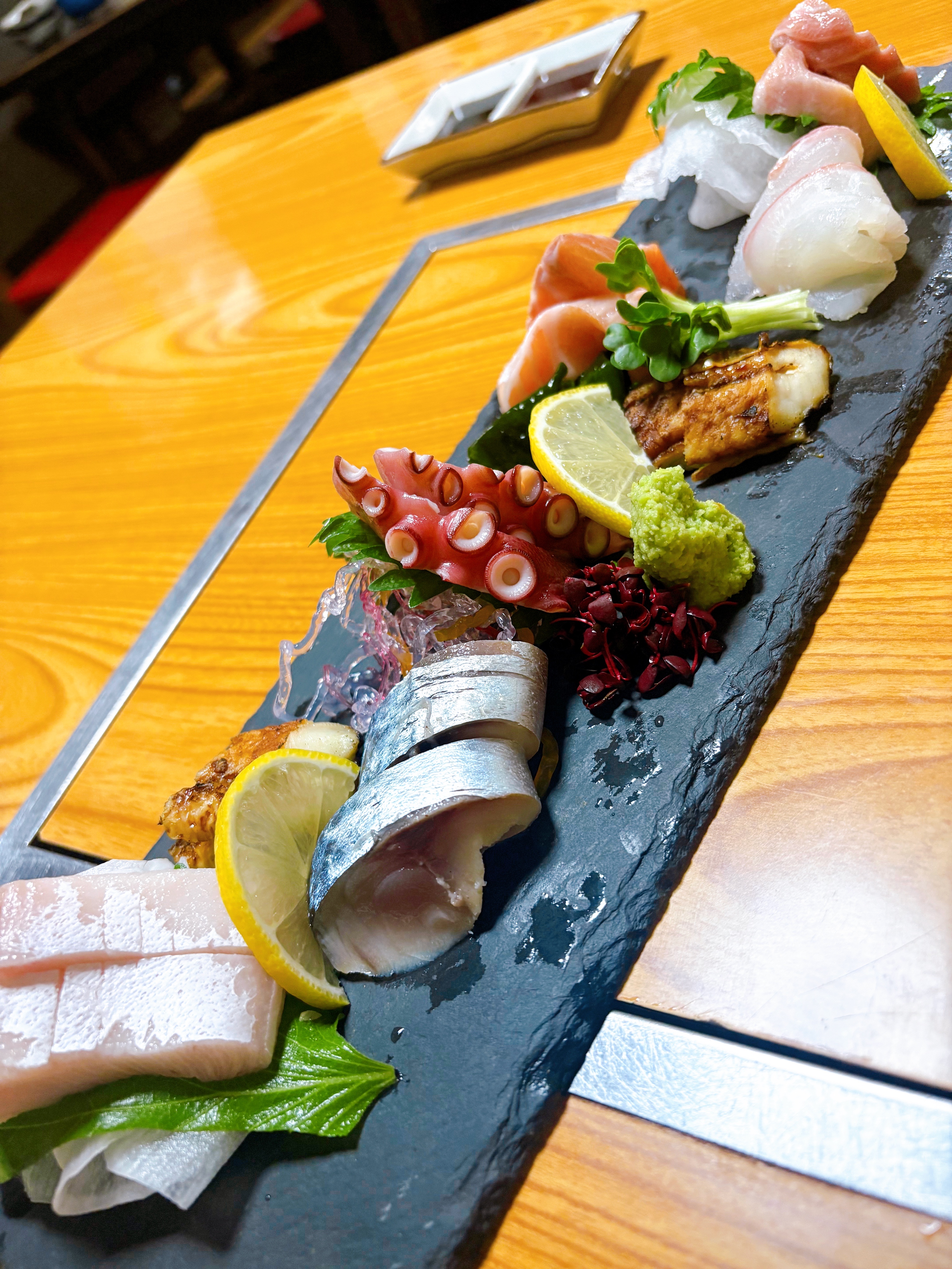 お刺身盛り、牡蠣酢、平目の薄造り